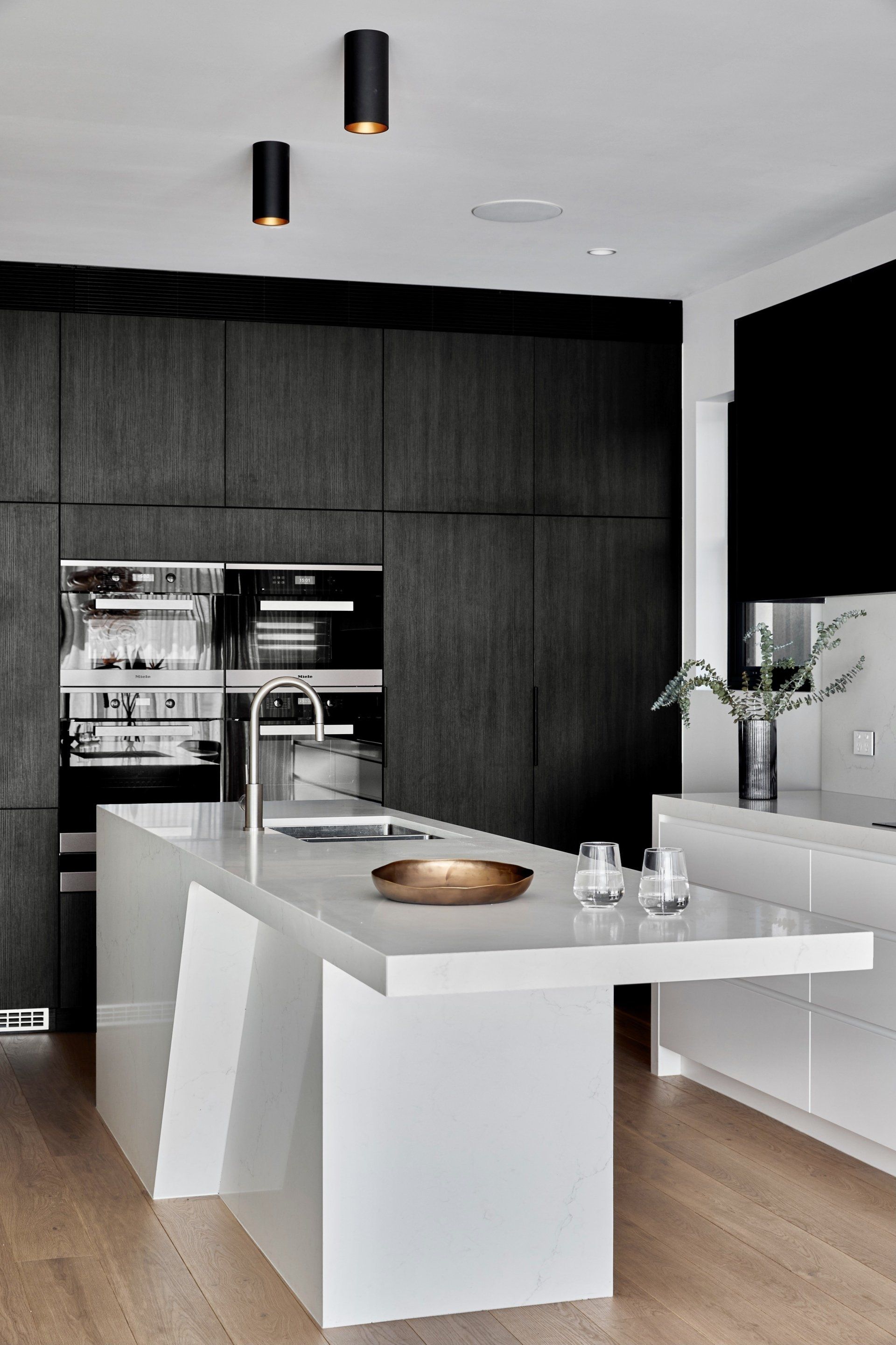 - The new kitchen features a sculpted stone central island and matt black floor-to-ceiling cabinetry.