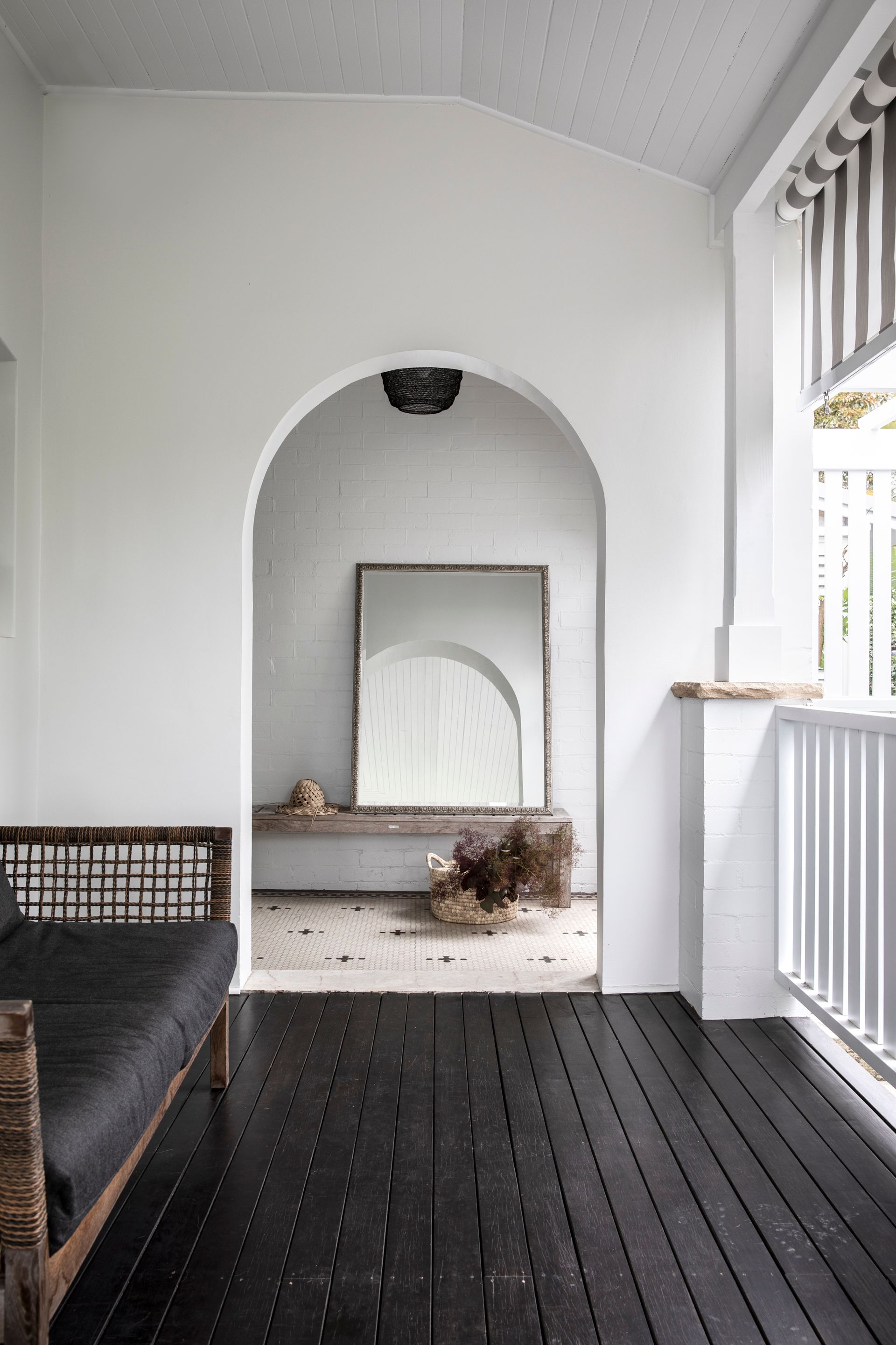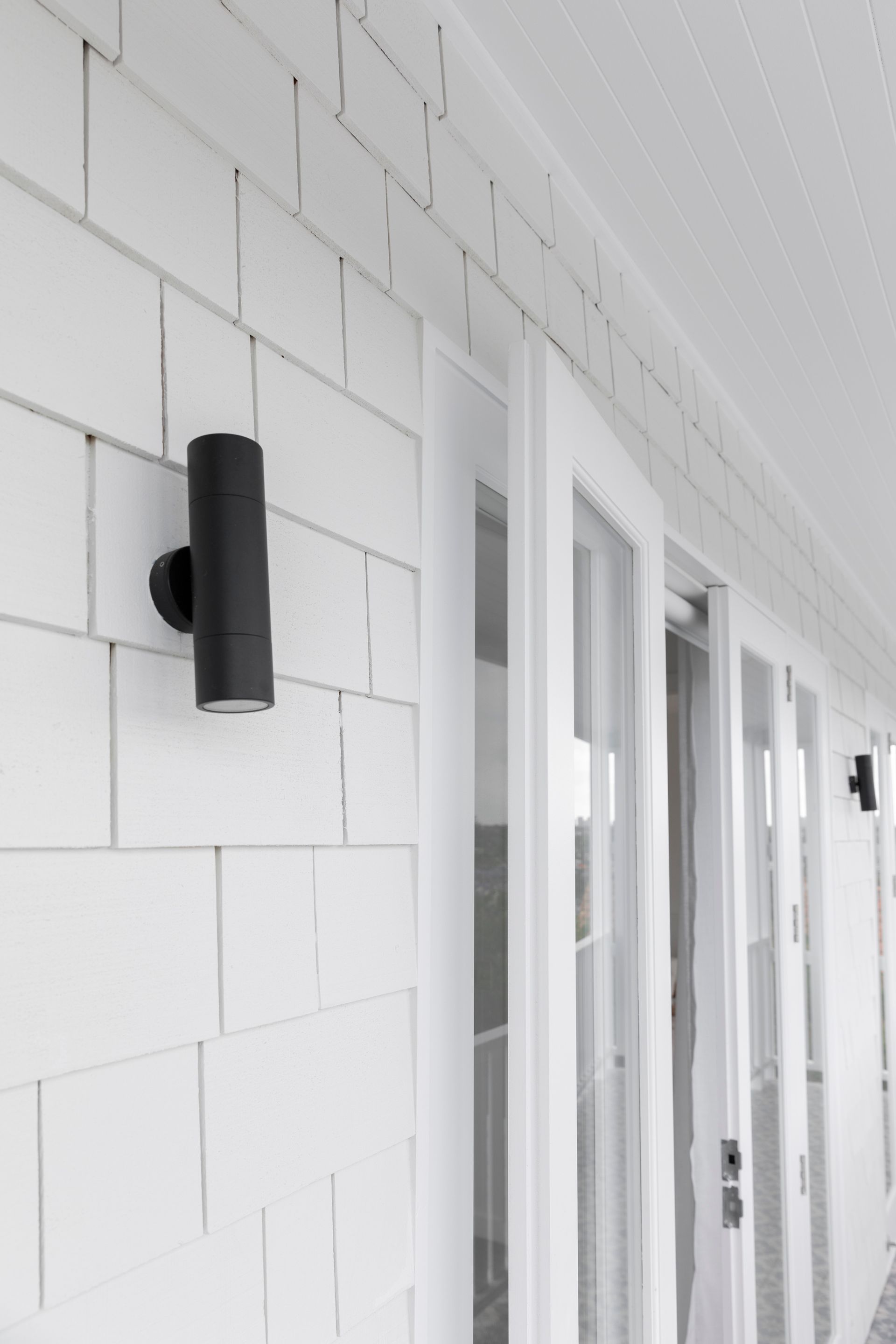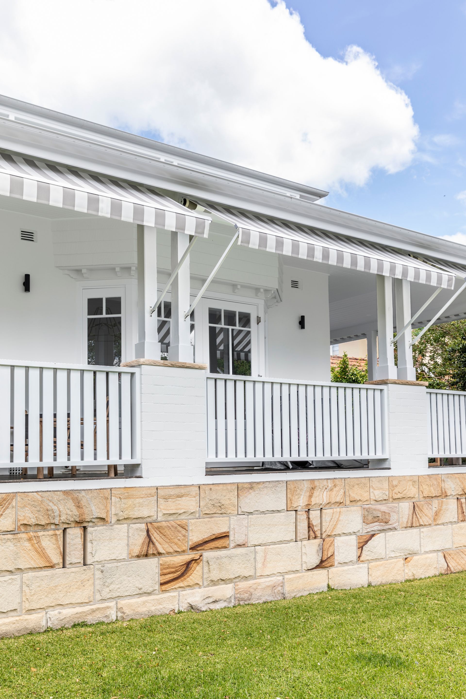 Both the rear and front façades underwent a light makeover, with the installation of a new entry porch, balustrades, and front boundary fence. Timber shingle cladding provides texture and a point of difference, while timber windows, balustrades, and v-groove planks align with the original materials and detailing of the home. New roofing creates a cohesive finish, and a minimalist light palette complements the architecture and showcases the federation sandstone elements.