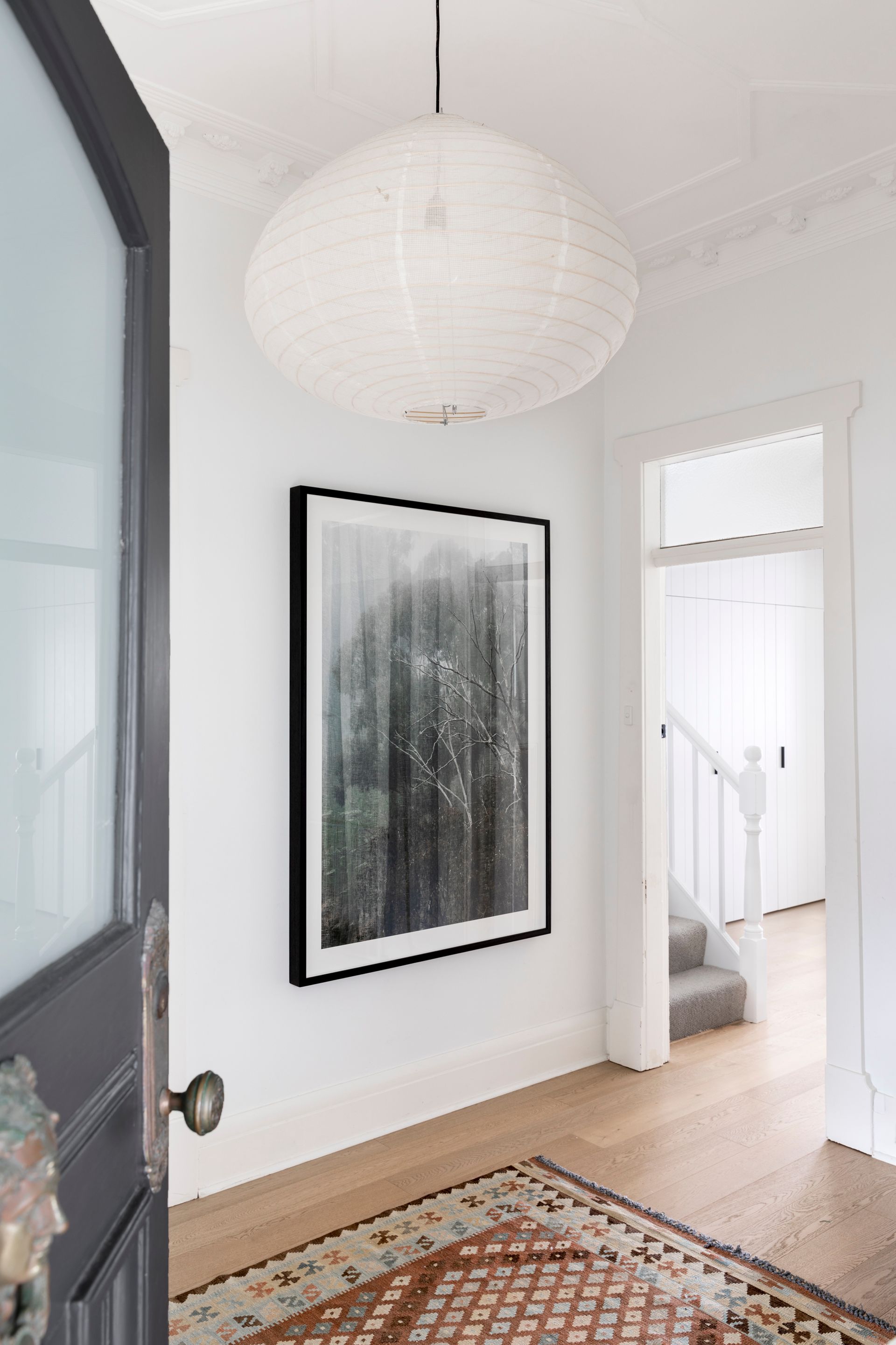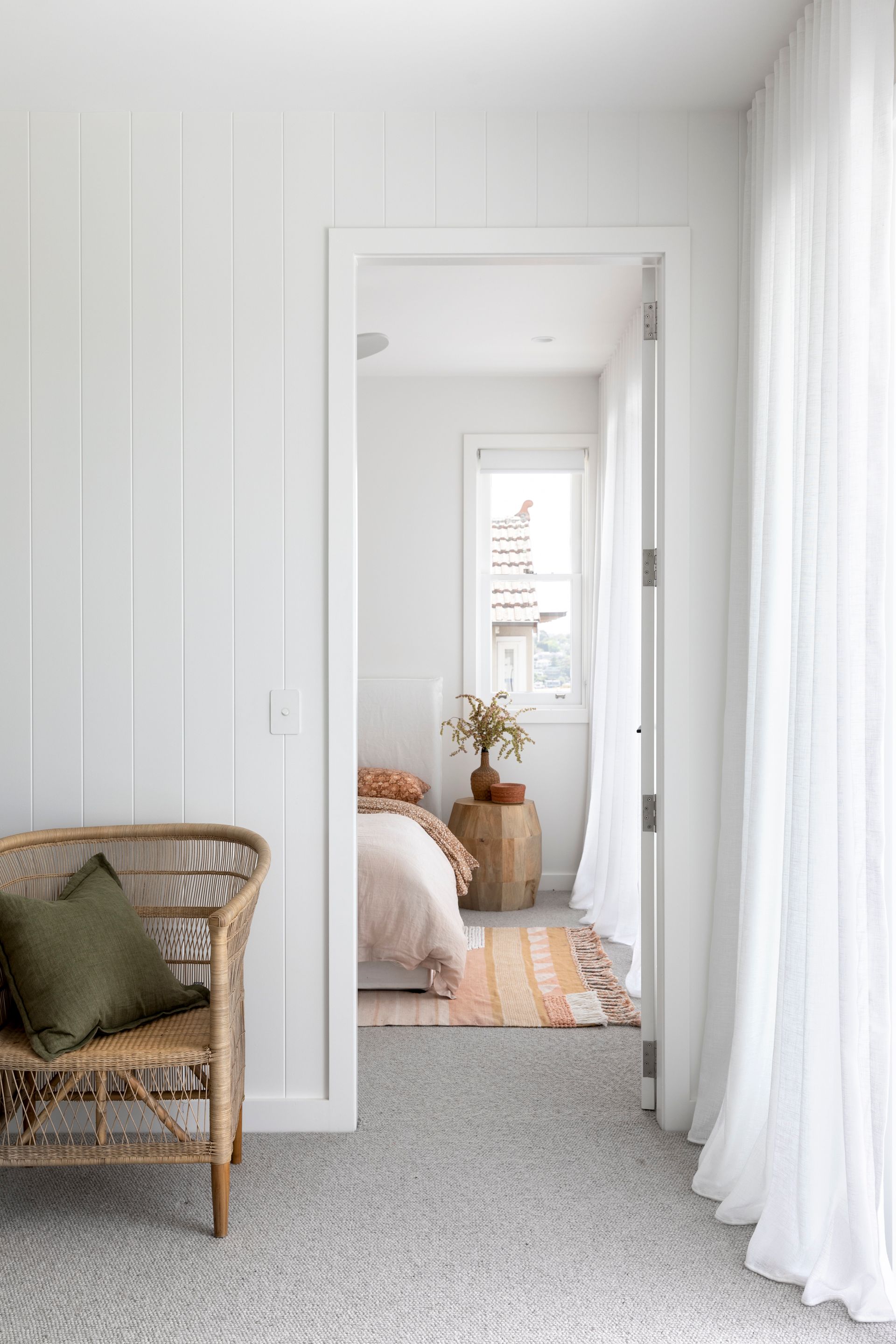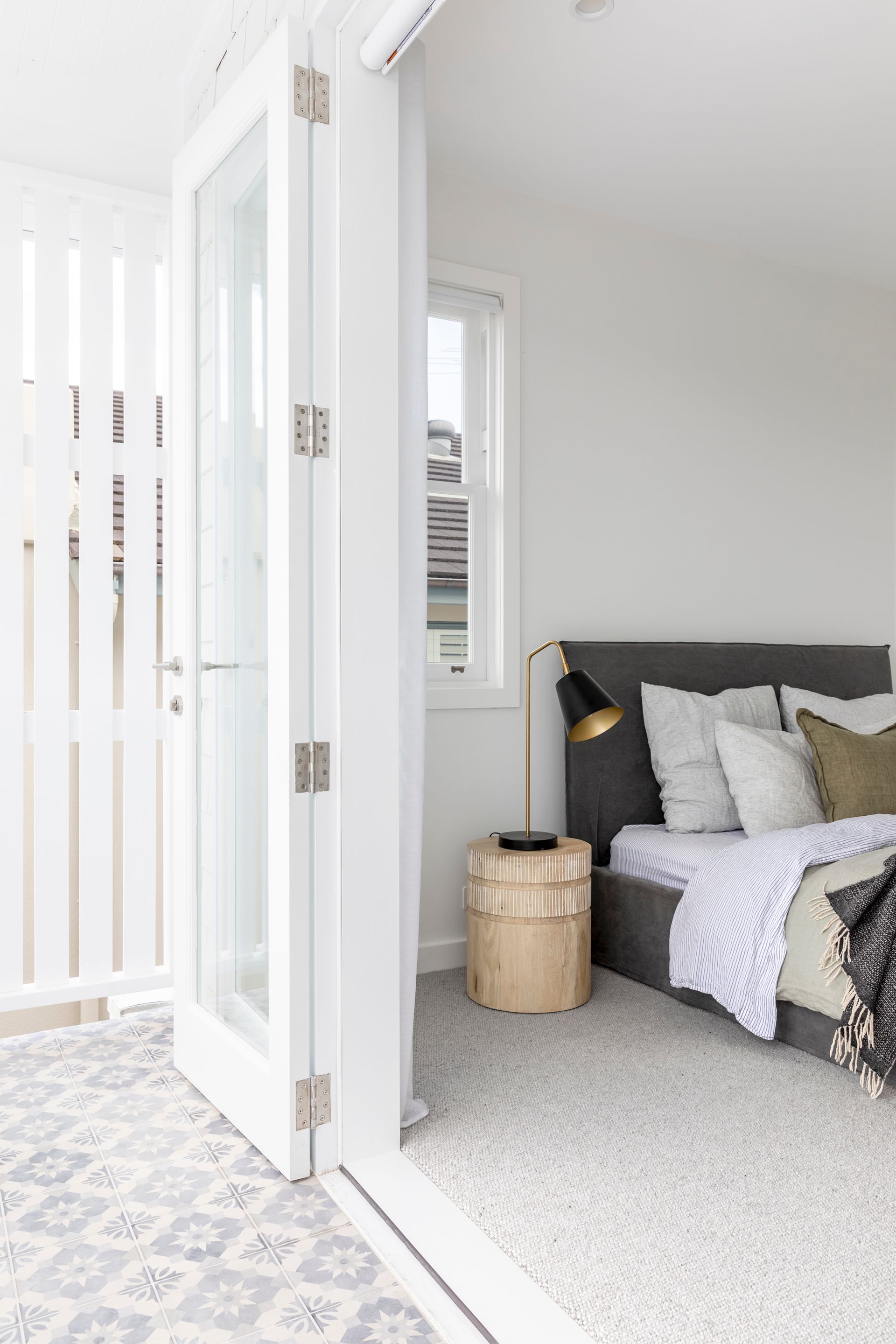 Both the rear and front façades underwent a light makeover, with the installation of a new entry porch, balustrades, and front boundary fence. Timber shingle cladding provides texture and a point of difference, while timber windows, balustrades, and v-groove planks align with the original materials and detailing of the home. New roofing creates a cohesive finish, and a minimalist light palette complements the architecture and showcases the federation sandstone elements.