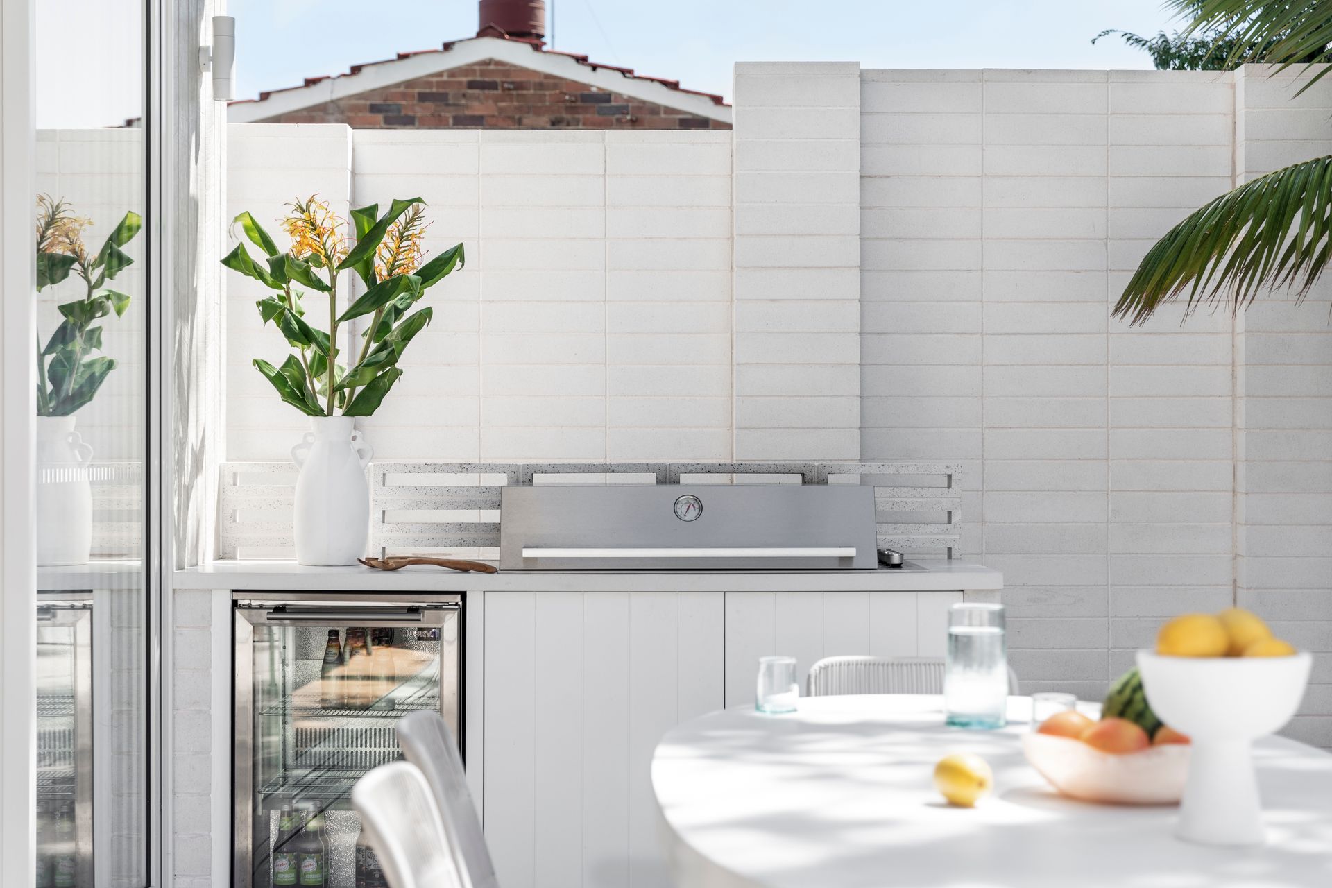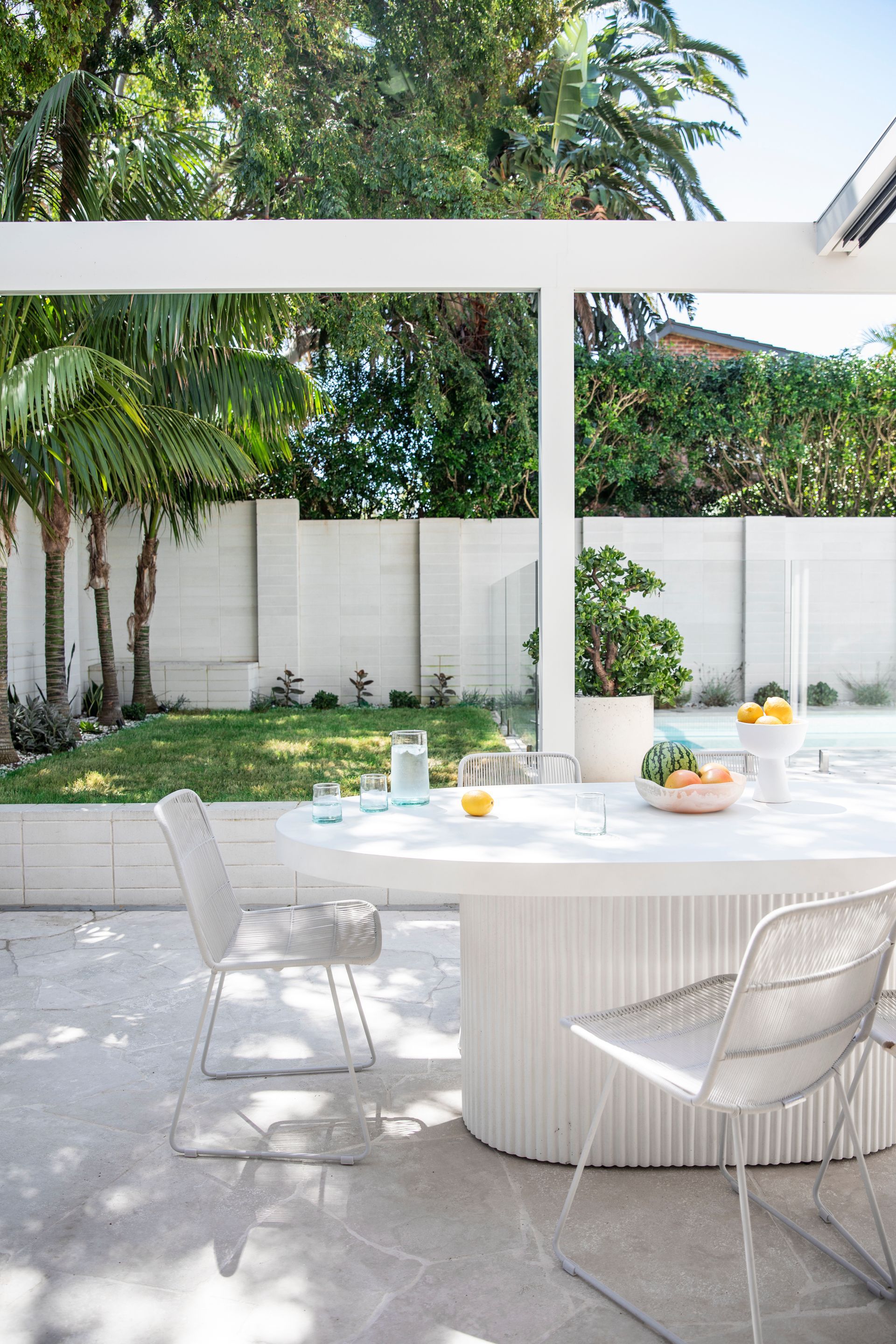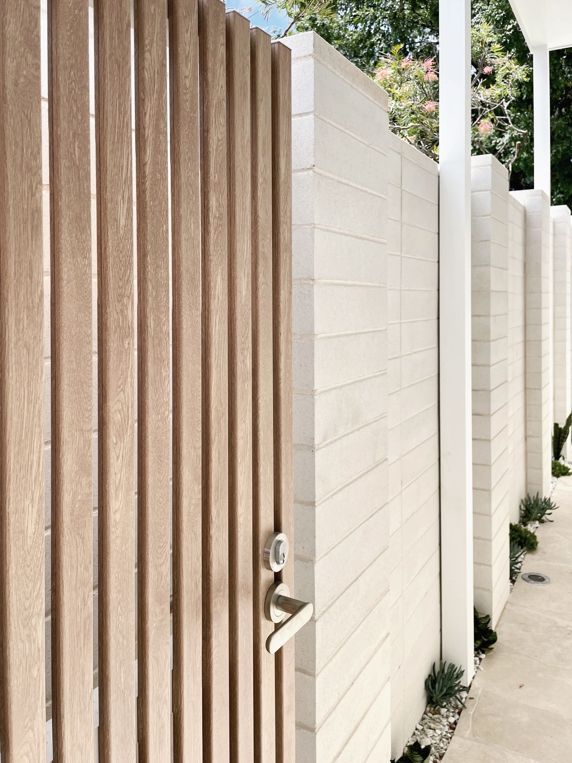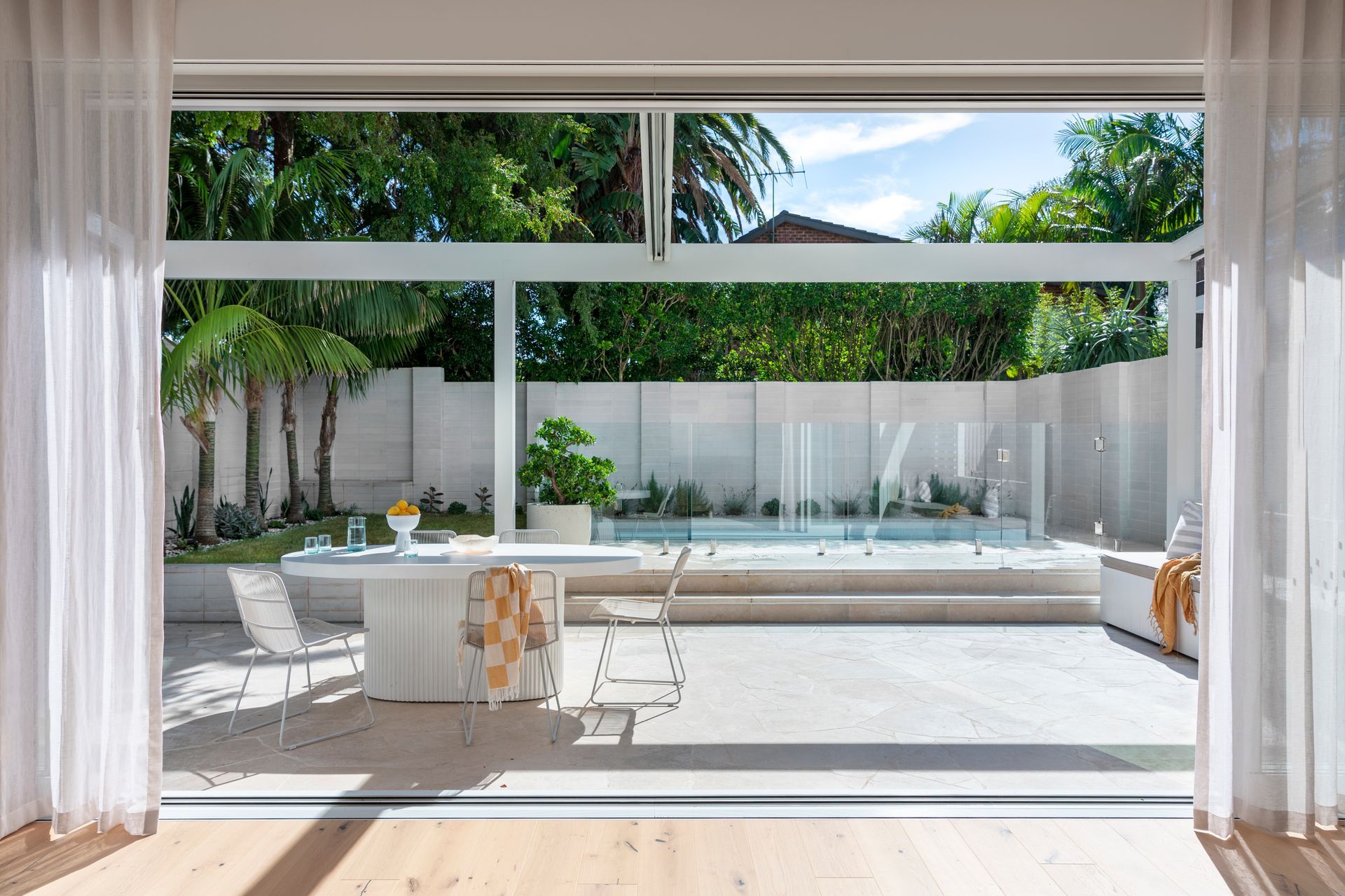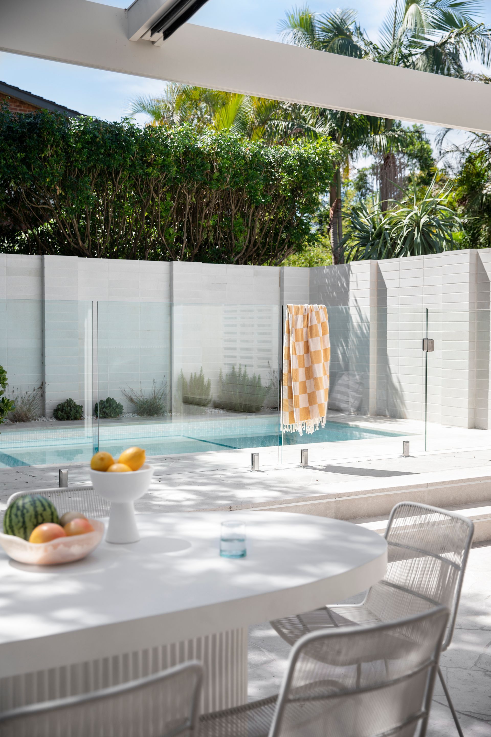 Expansive sliders across the rear connect the open-plan living area to the garden, extending the overall space, and a retractable pergola awning provides all-weather shelter over the entertaining area. A prefabricated tiled pool is integrated for a custom look at lower cost. Breezeway block walls and linear screens create privacy and filtered light-plays, complemented by low-maintenance landscaping.
