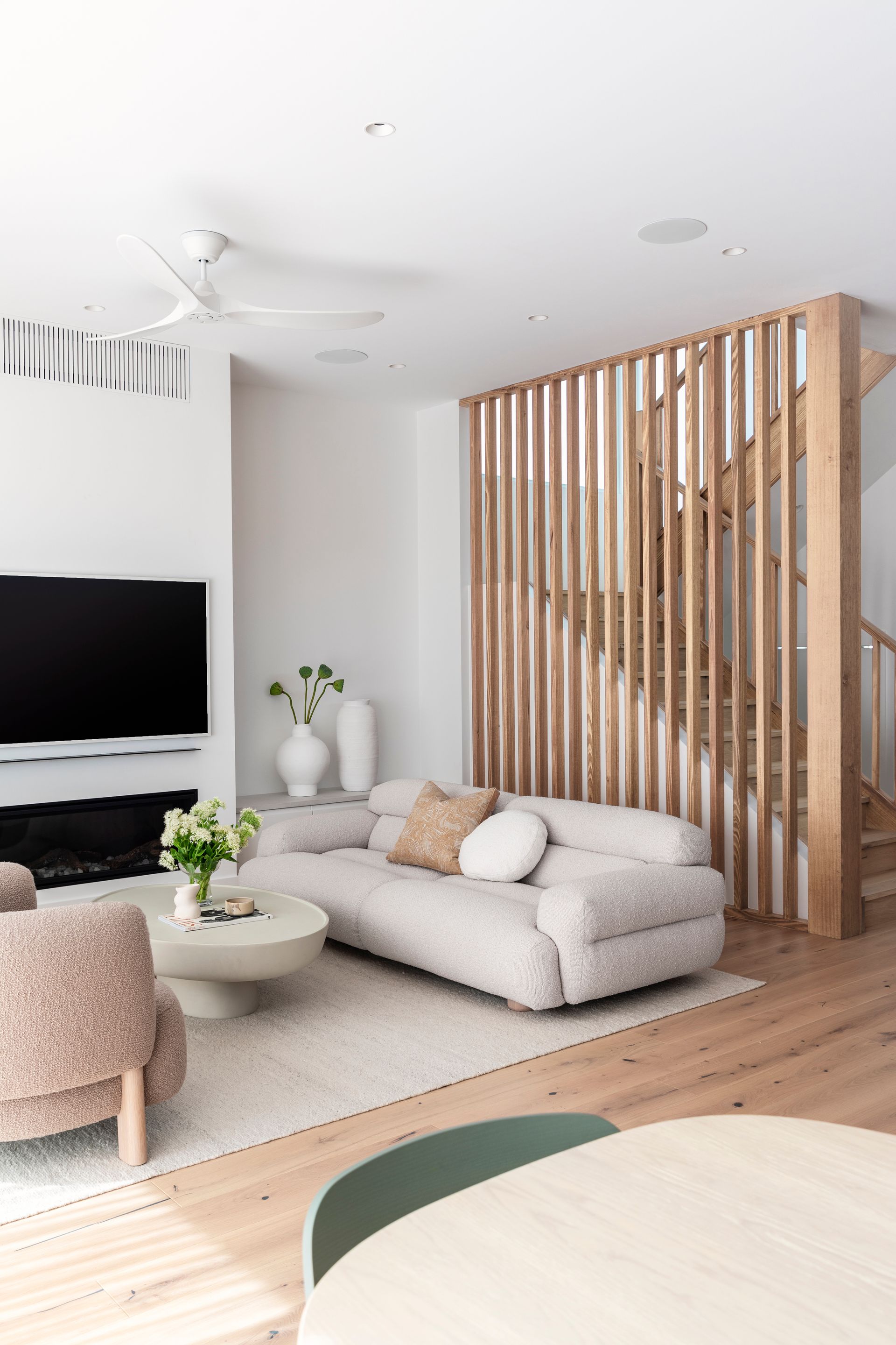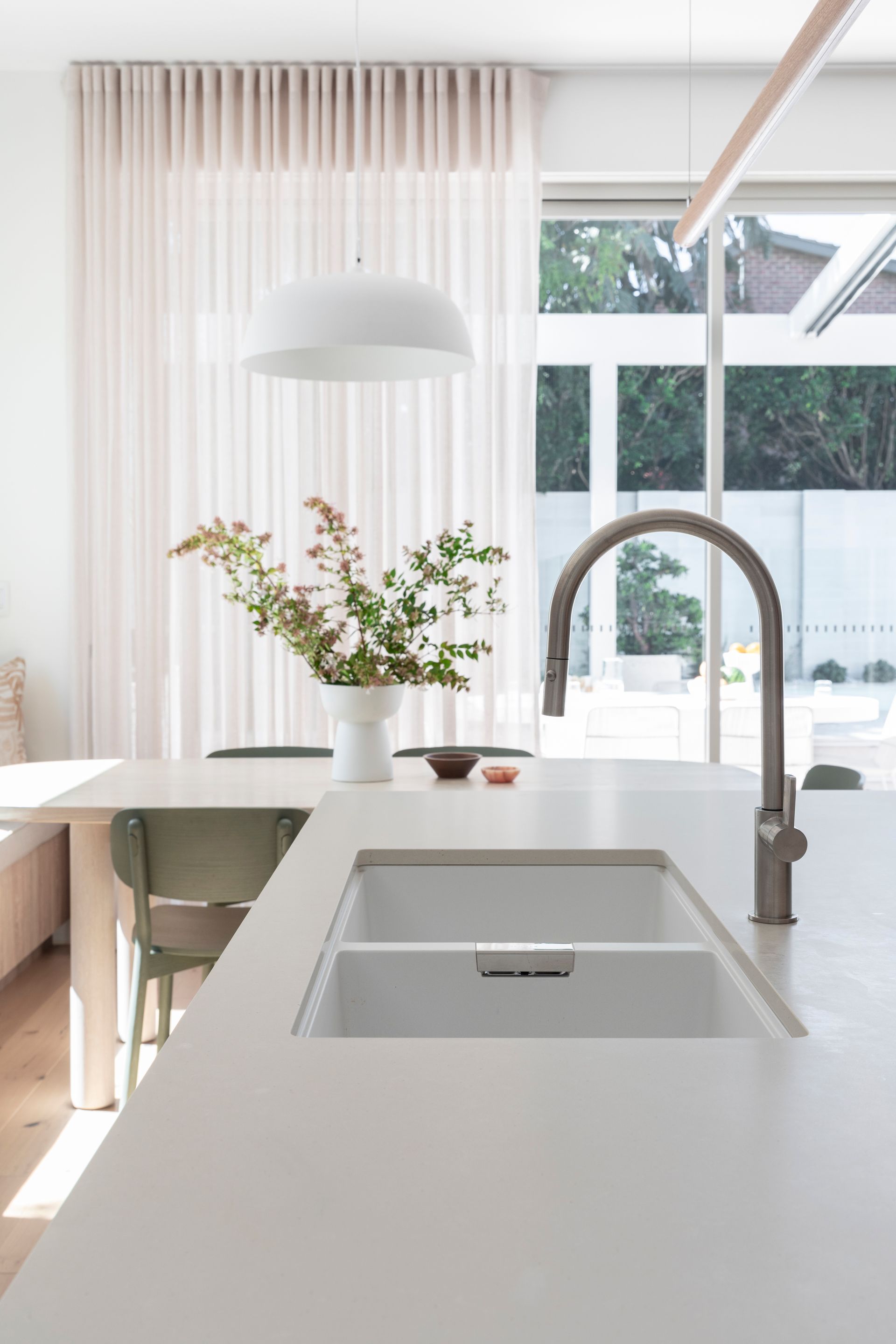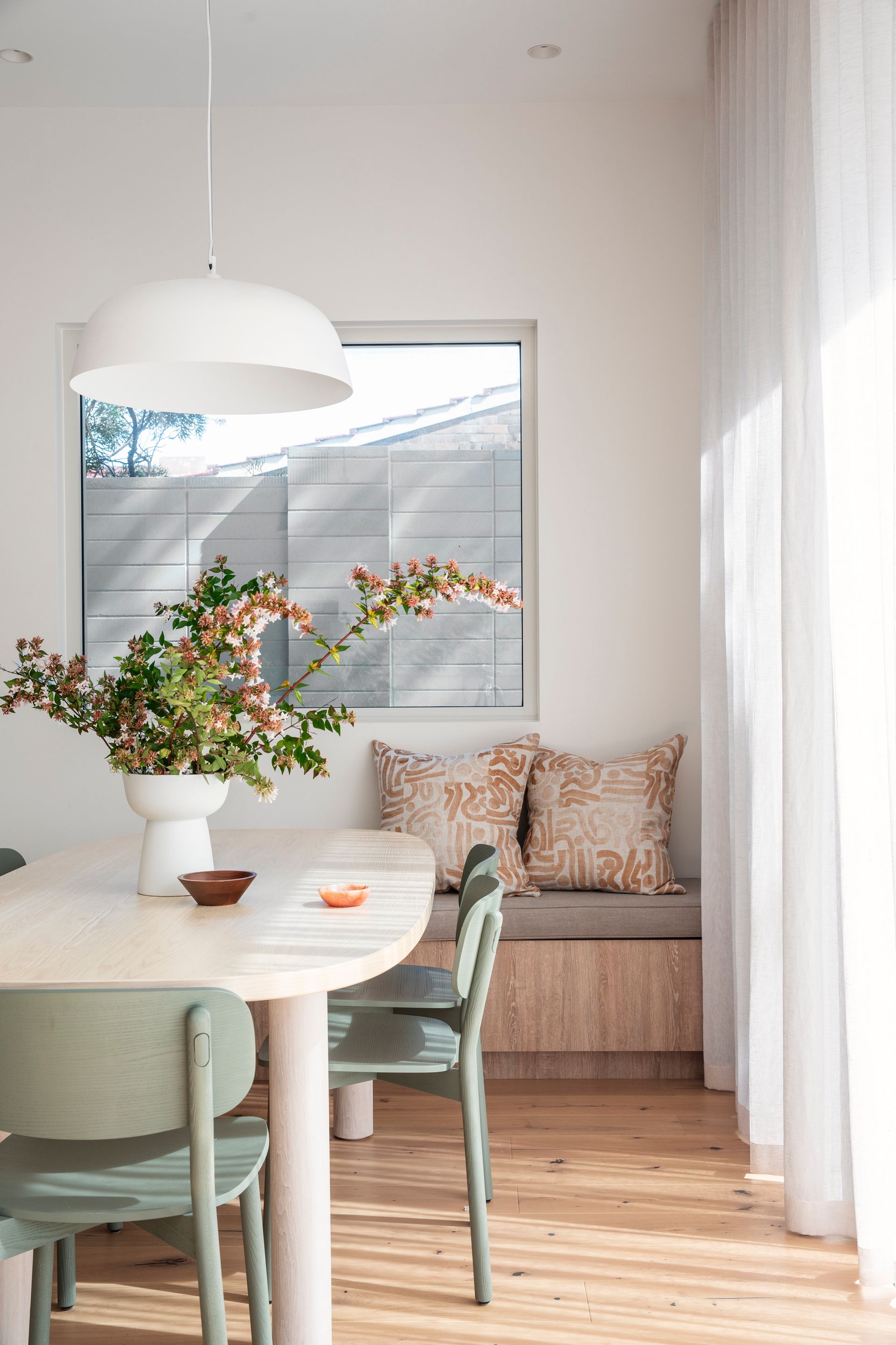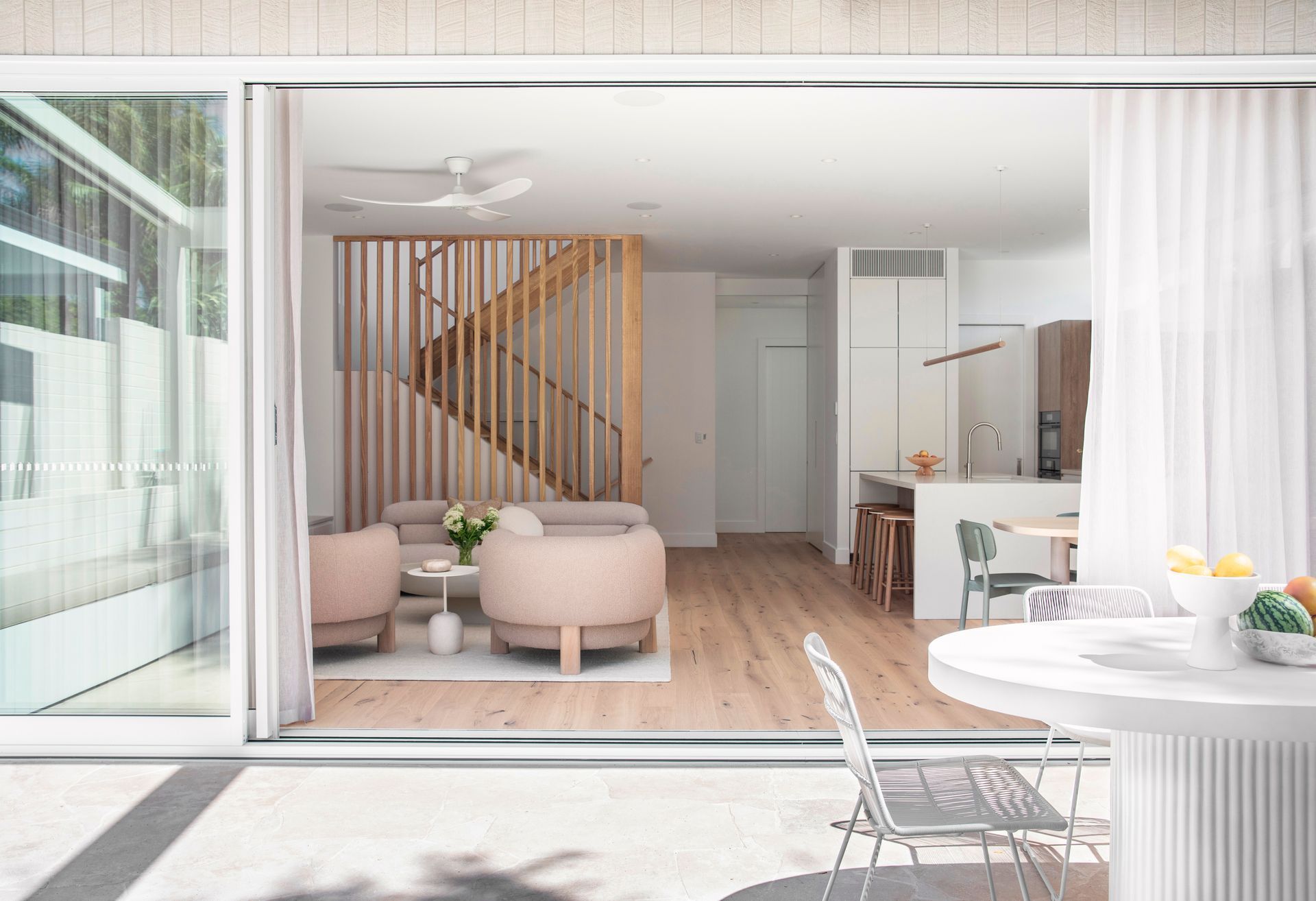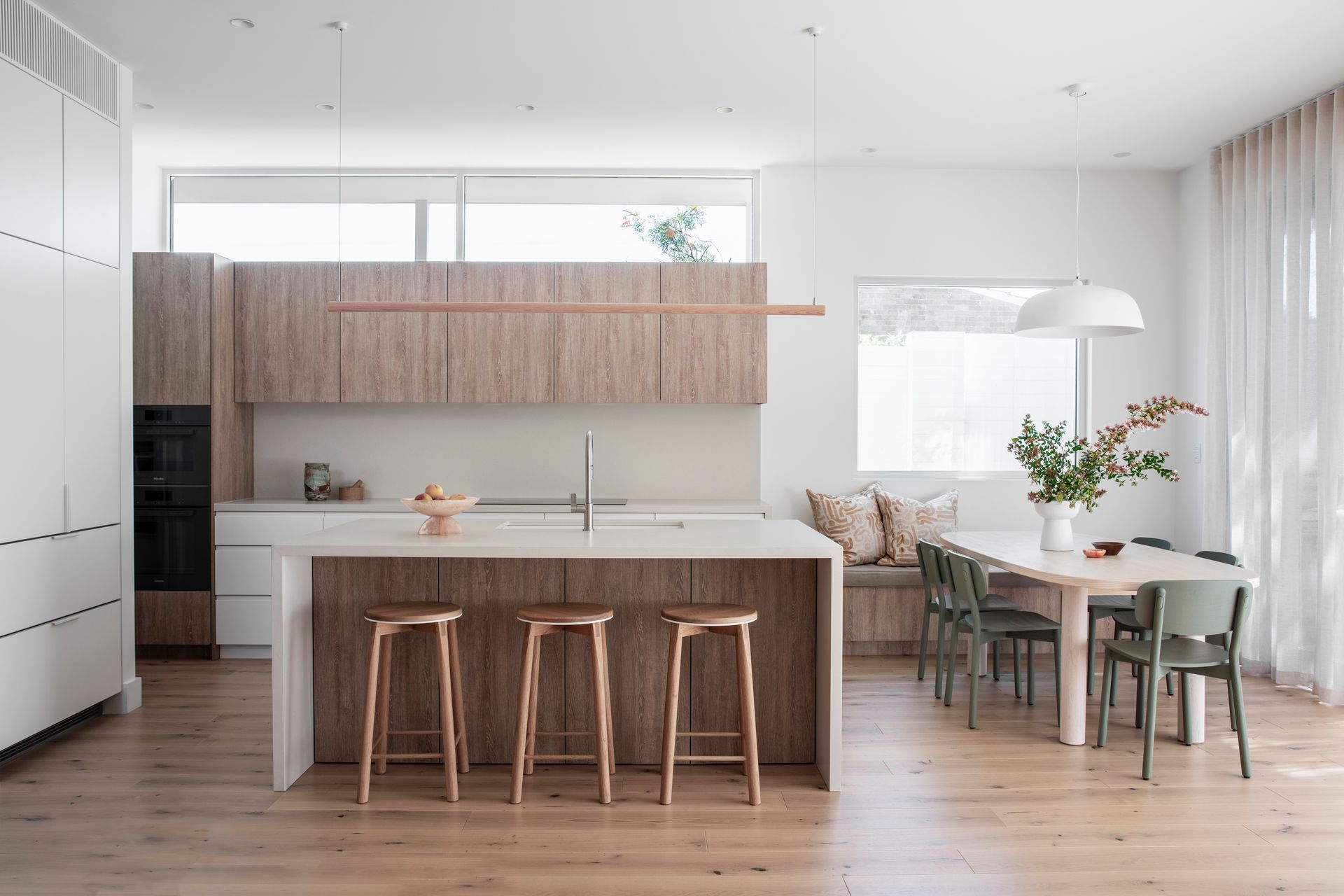 The interiors feature nature-inspired neutral tones, textural tiles, and soft timber accents. Carefully curated furniture and décor complement the overall aesthetic and material selections, and the palette harmoniously carries through to the exterior, extending the sense of overall living space.
