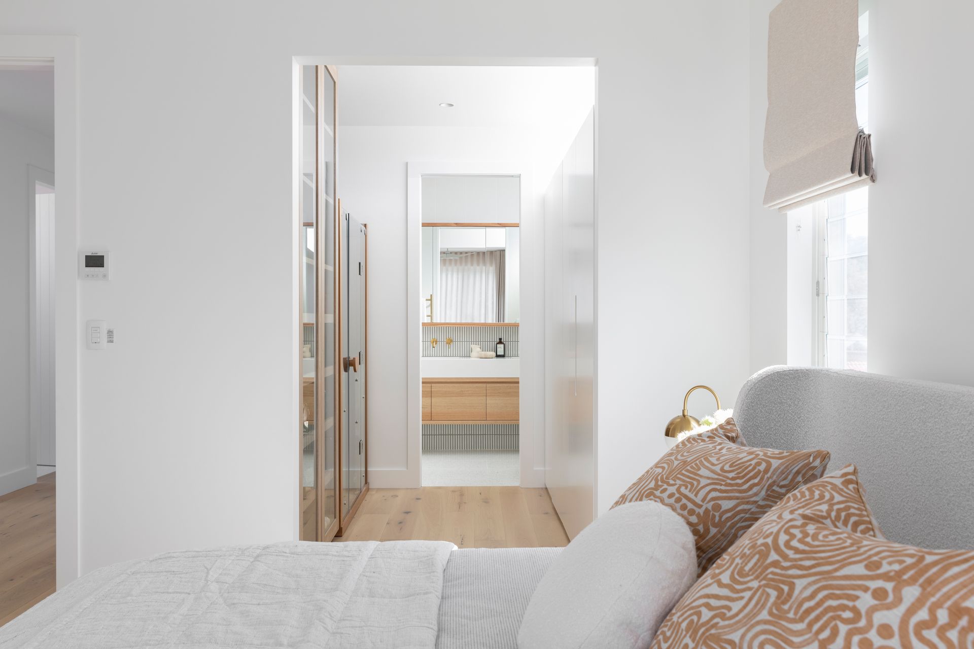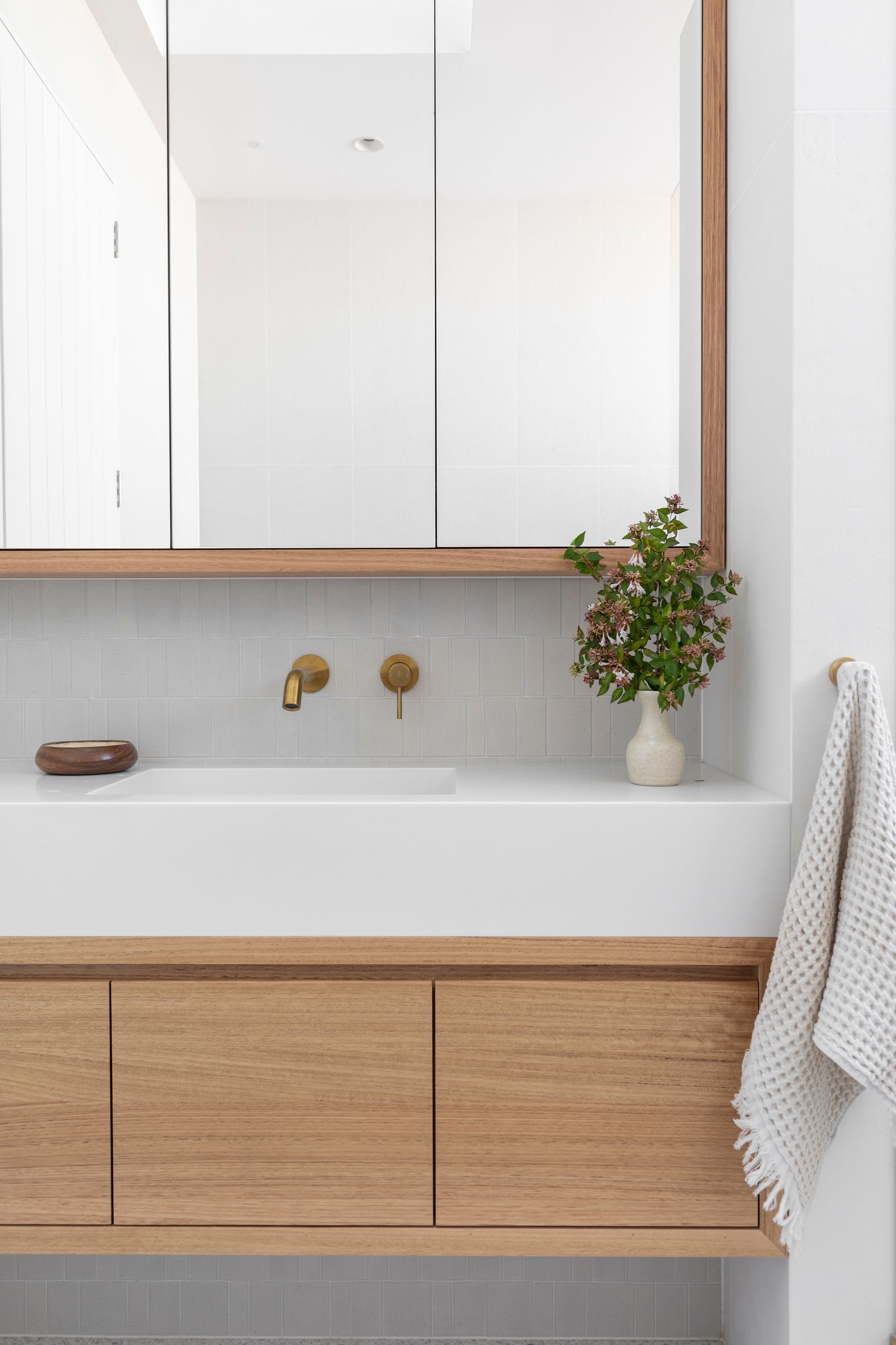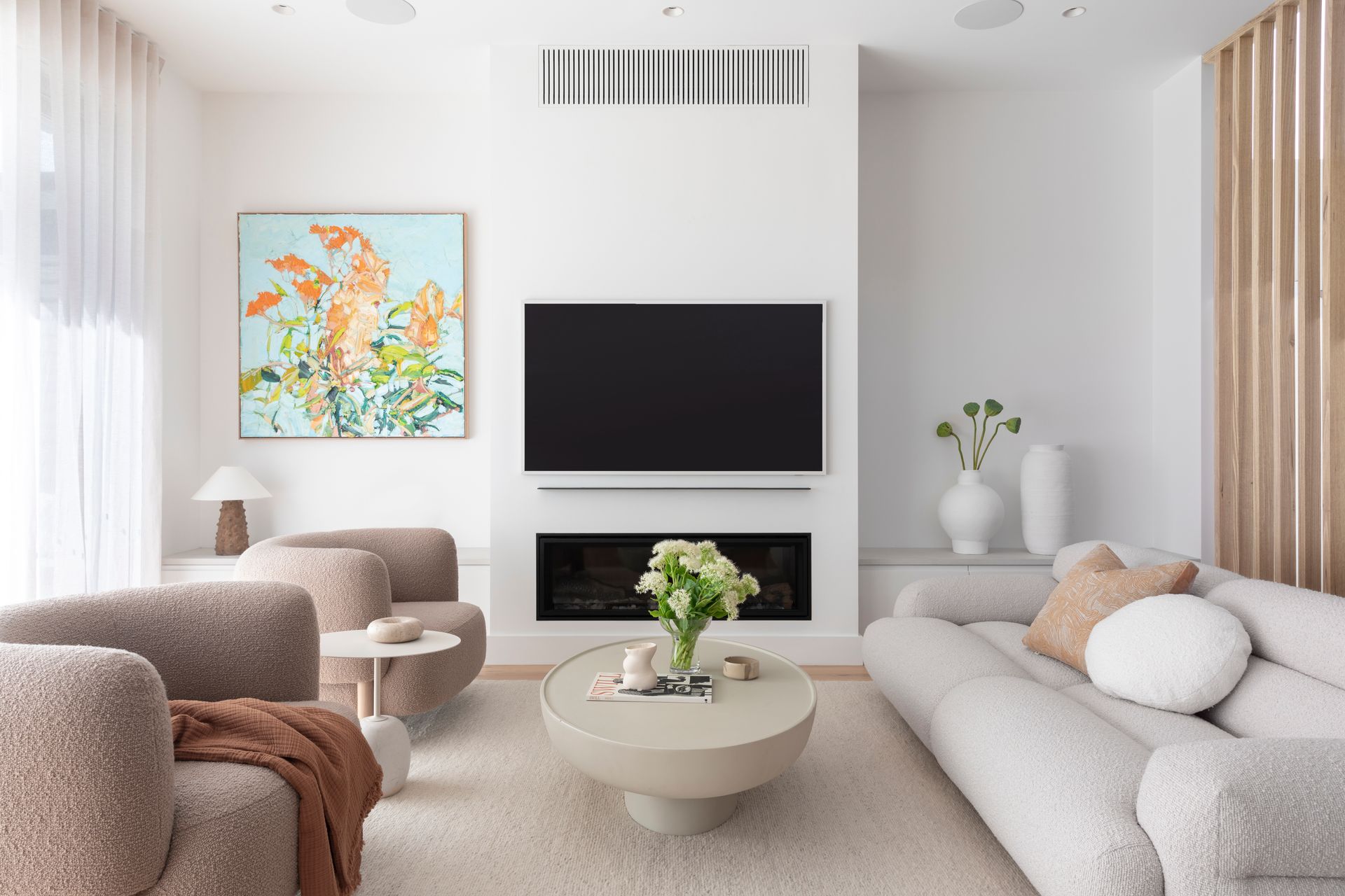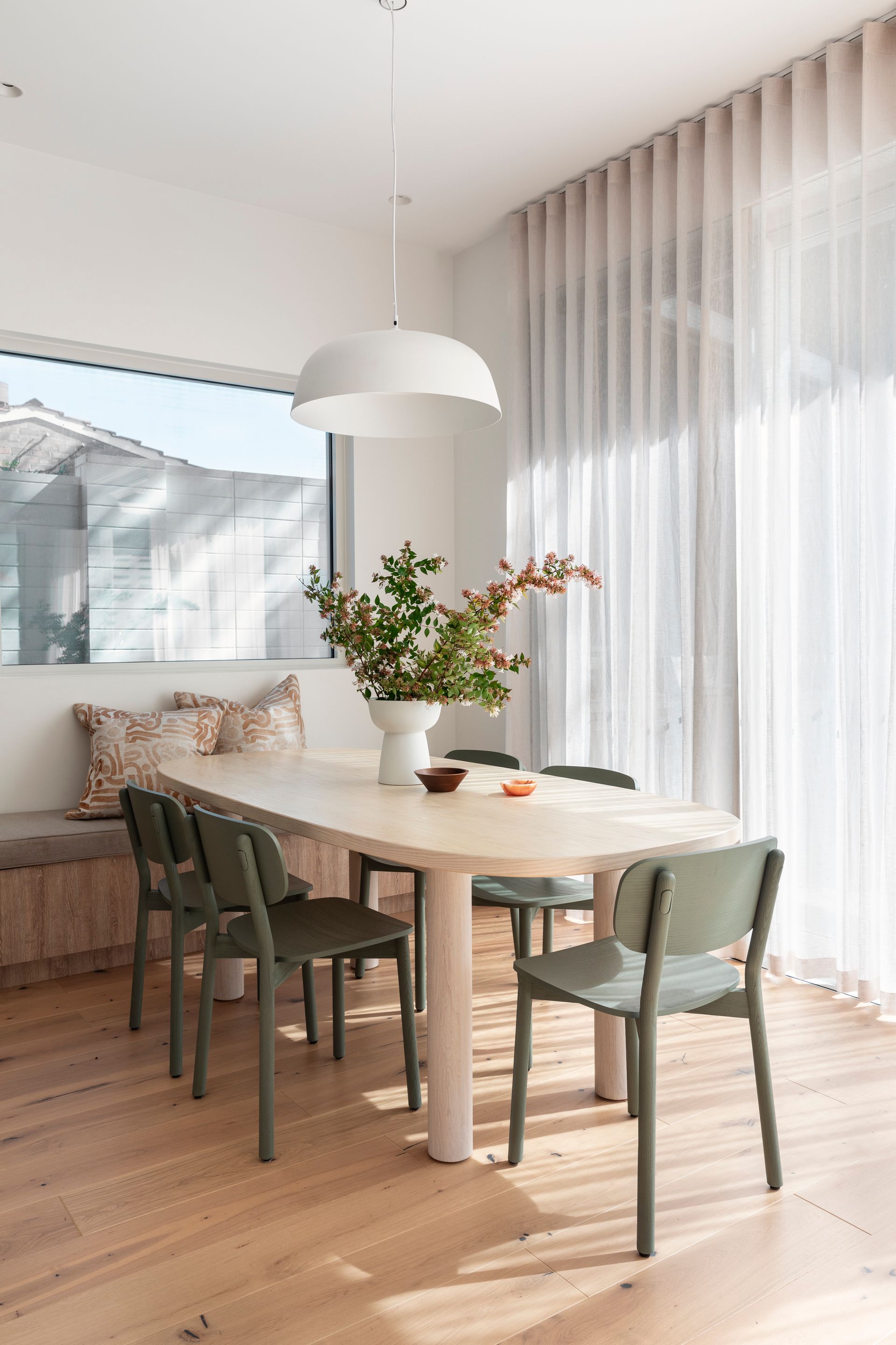The interiors feature nature-inspired neutral tones, textural tiles, and soft timber accents. Carefully curated furniture and décor complement the overall aesthetic and material selections, and the palette harmoniously carries through to the exterior, extending the sense of overall living space.